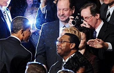 President Barack Obama makes a surprise visit to the crowded Brady Press