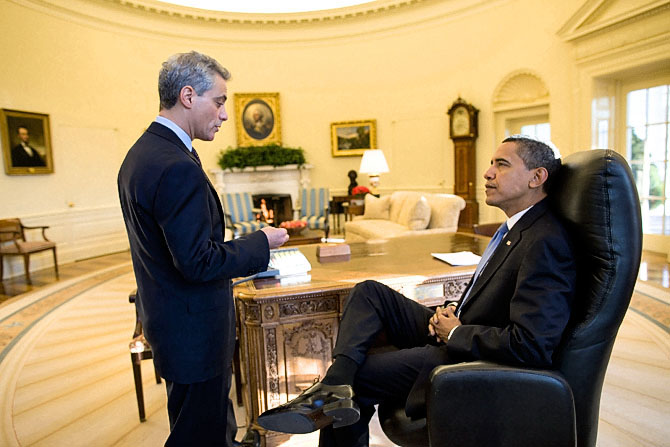 day. (left center). Chief of Staff Rahm Emmanuel talks to President