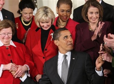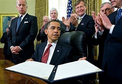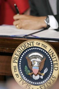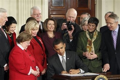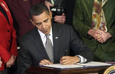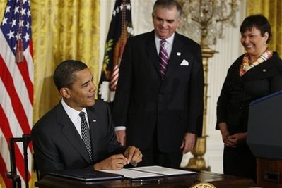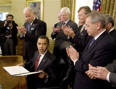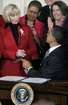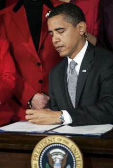 historic moment of Obama's signing of his first bill. |
