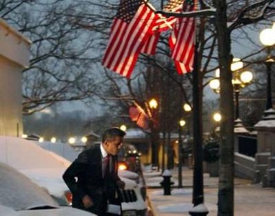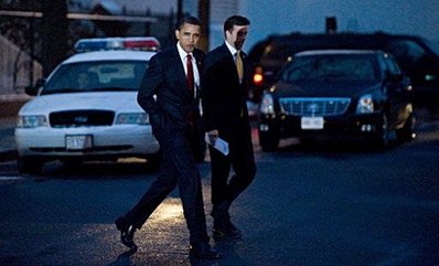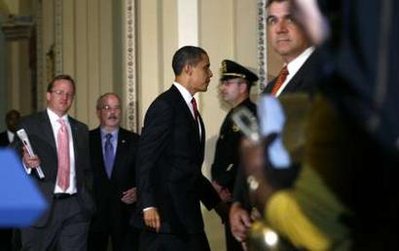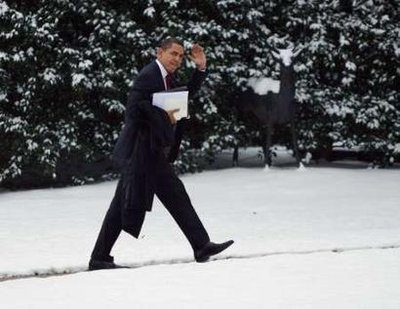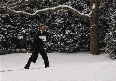 President Obama treks from meetings at the Capitol after a snowy day in