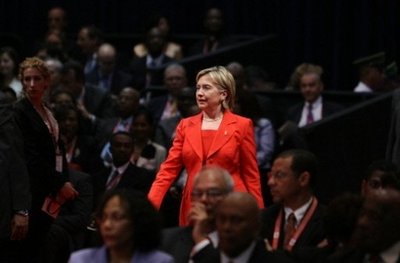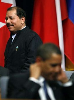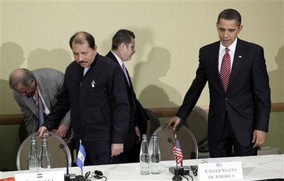 Hillary Clinton sitting behind him, sat next to Nicaragua's President