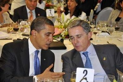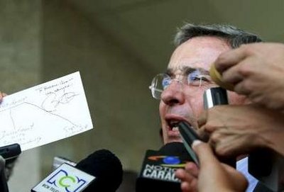 sat next to Colombian President Alvaro Uribe, who later showed the press