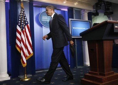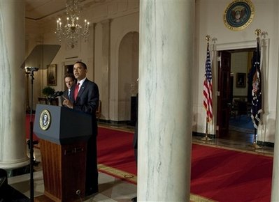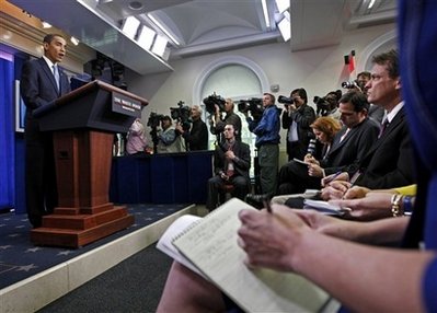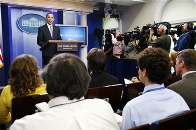 President Barack Obama speaks to the media in the Grand Foyer of the