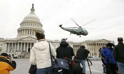 A helicopter departs the East Front of the Capitol Building rehearsing