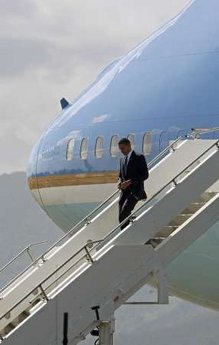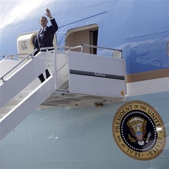 departs Andrews Air Force Base on Air Force One (photo top left), and lands in