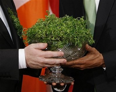 President Barack Obama is given a bowl of shamrocks by Irish Prime