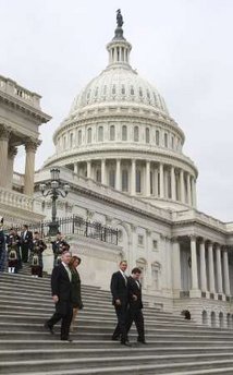 President Obama. led by a bagpiper, walks down the Capitol Hill stairs