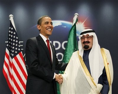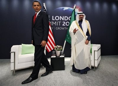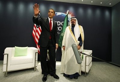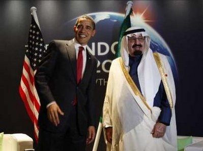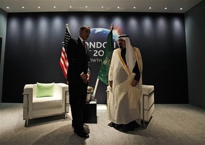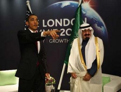 meets with Saudi Arabia's King Abdullah at the Excel Centre in London on