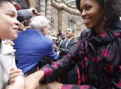 President Barack Obama and First Lady Michelle Obama are greeted by French