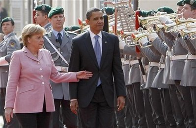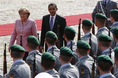 President Barack Obama joins German Chancellor Angela Merkel to inspect